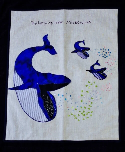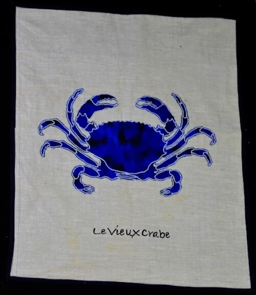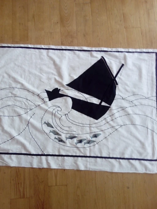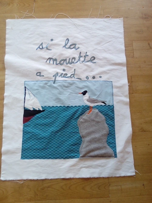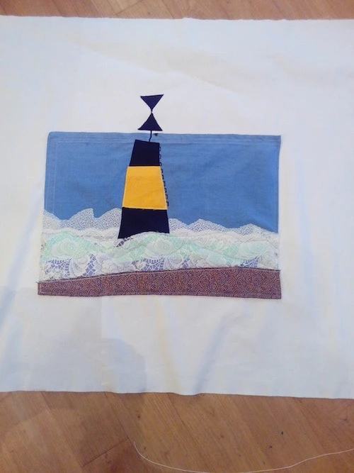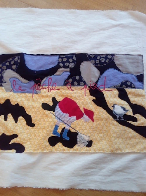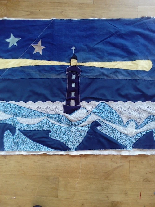 Un tissu de coton bleu un peu usé fait un ciel nocturne parfait. Pour la forme des vagues de la mer, je me suis inspirée d’un tableau de Nicolas Vial.