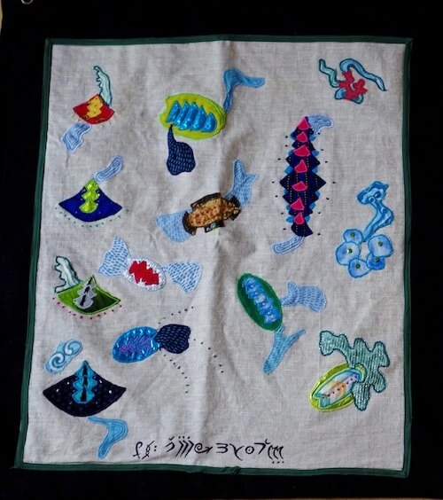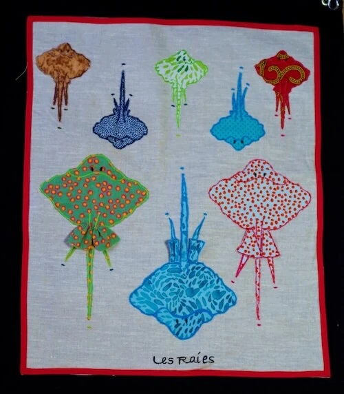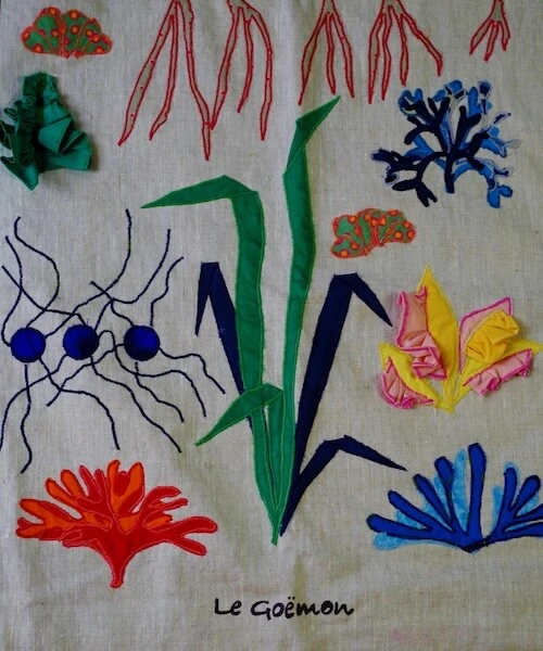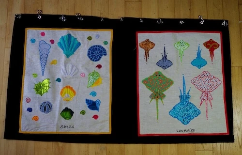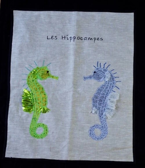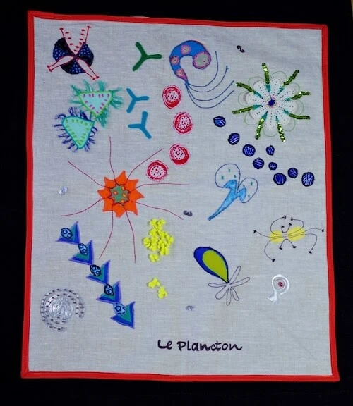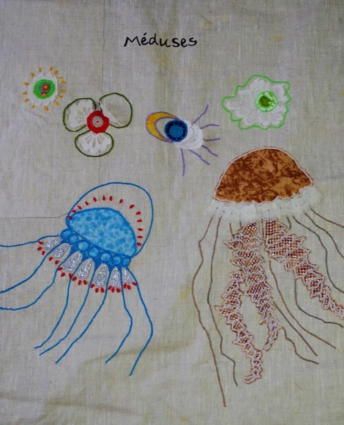 A Bel Espoir somptueux, il fallait des rideaux de roof somptueux. Je me suis calée sur l’idée des planches pédagogiques. J’en ai fait douze. Quatre mois de boulot. J’adore. Je me lève le matin, et couture jusqu’au soir. Je sais bien qu’il y a un petit côté autistique à oeuvrer ainsi, mais ça dérange qui ? Là aussi, je me documente beaucoup. Comment aurais-je imaginé les formes invraisemblables des larves de méduse, sinon ?