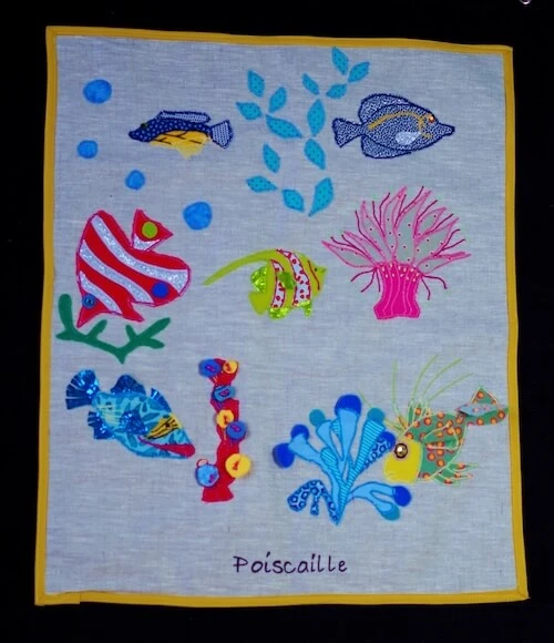 J’ai rajouté les poissons argentés, réalisés avec les trousses Air France que mon frère me ramène. Il voyage très chic