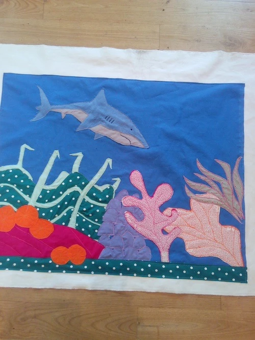 Par la suite, j’ai rajouté un demi-requin sur la droite, qui sort du tableau.