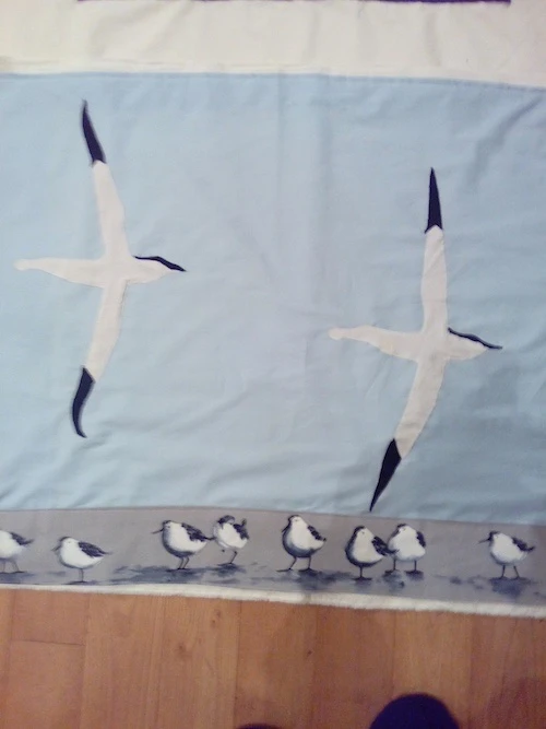 Les petits oiseaux du bas sont imprimés sur un tissu qui m’avait sauté aux yeux dans le magasin. Les magasins de tissu sont des endroits dangereusement addictifs.