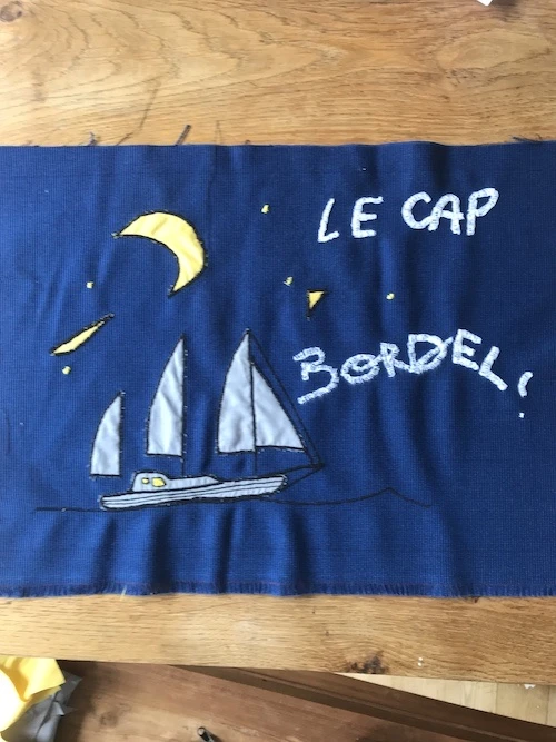 Début décembre 2017, l’idée me prend de réaliser des panneaux décoratifs, à appliquer sur les rideaux du roof du Rara Avis. J’ai bossé comme une dingue. Quand le bateau est parti fin janvier pour sa transatlantique, j’avais fait le job. Je n’avais pas calculé à quel point cette installation adoucit l’ambiance dans le roof, qui peut rassembler jusqu’à 40 personnes.