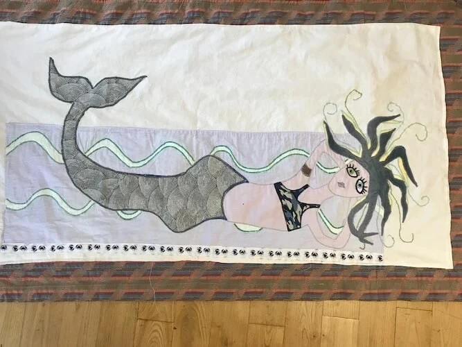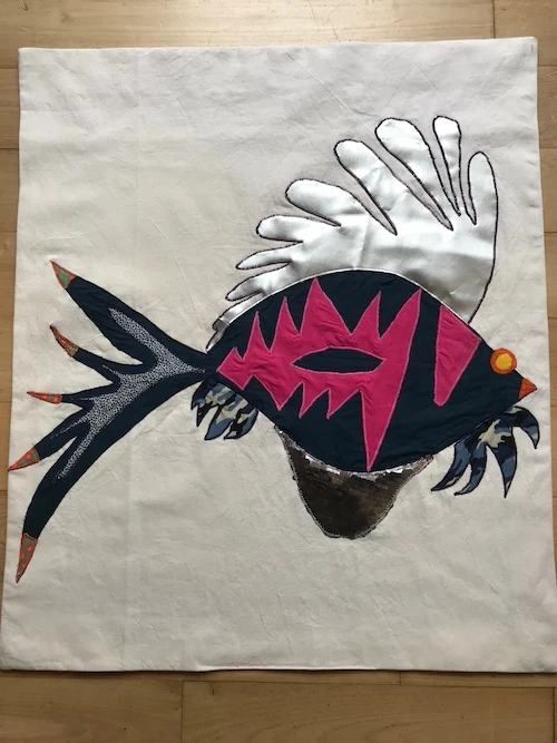 Elle est inspirée d’un dessin de Matisse. Pourquoi se gêner ? Dernièrement, j’ai trouvé un tissu imprimé d’yeux. J’en ai pris un petit métrage pour de prochaines sirènes. J’aime bien leur faire des yeux vairons.